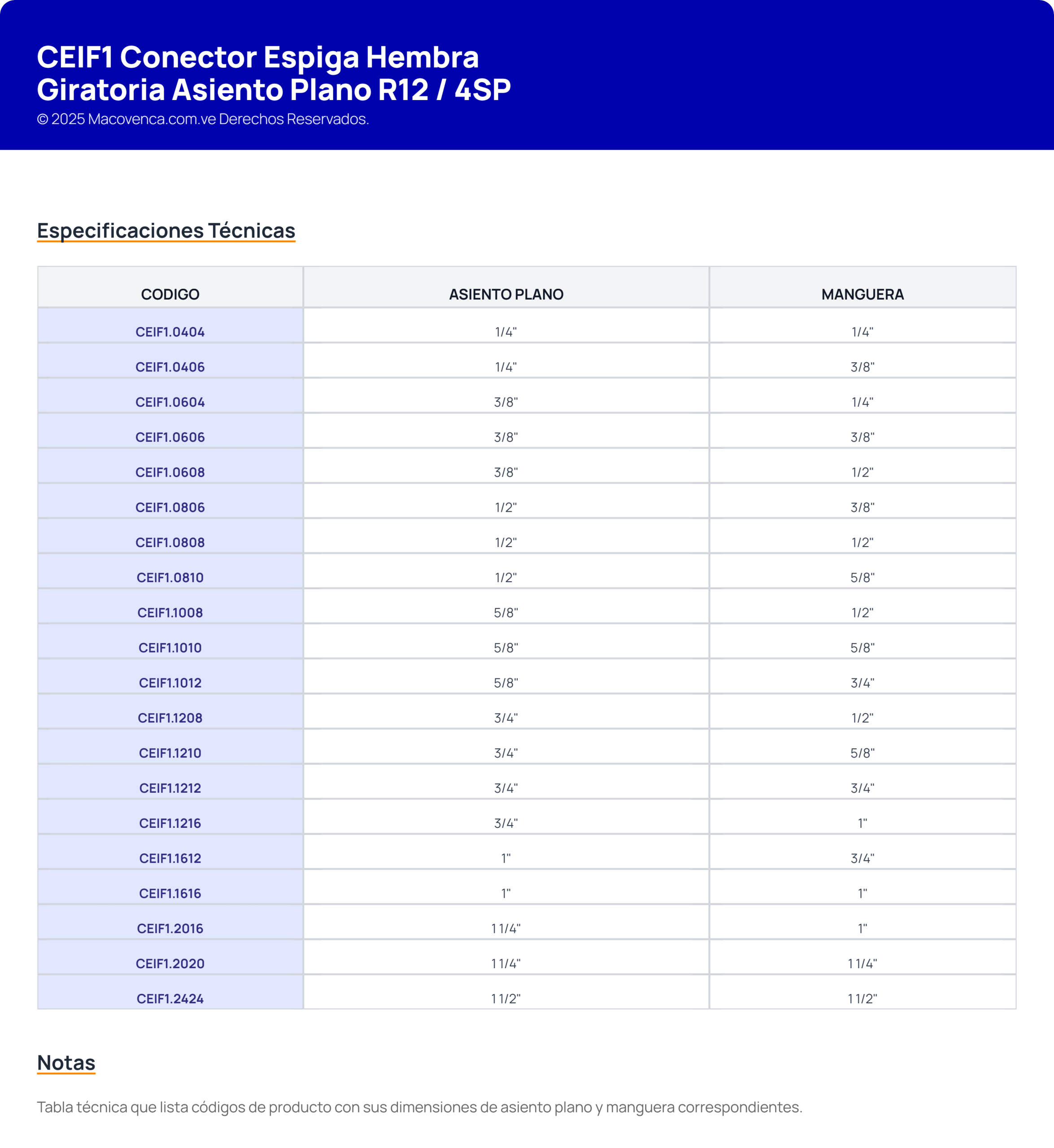 CEIF1 Conector Espiga Hembra Giratoria Asiento Plano R12 / 4SP