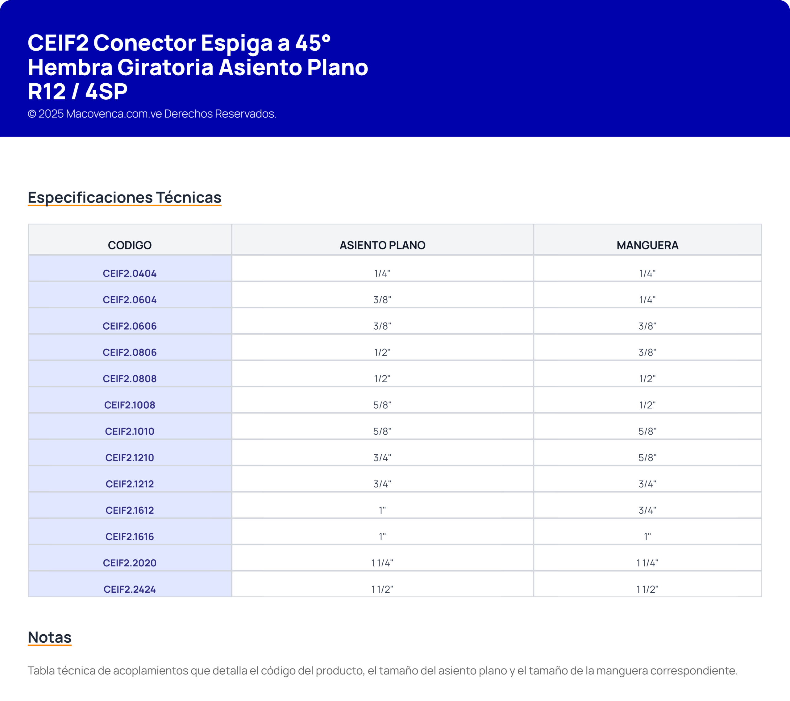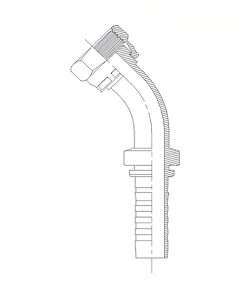 Conector (espiga) prensable a 45 grados con rosca hembra giratoria de asiento plano, para mangueras R12/4SP.