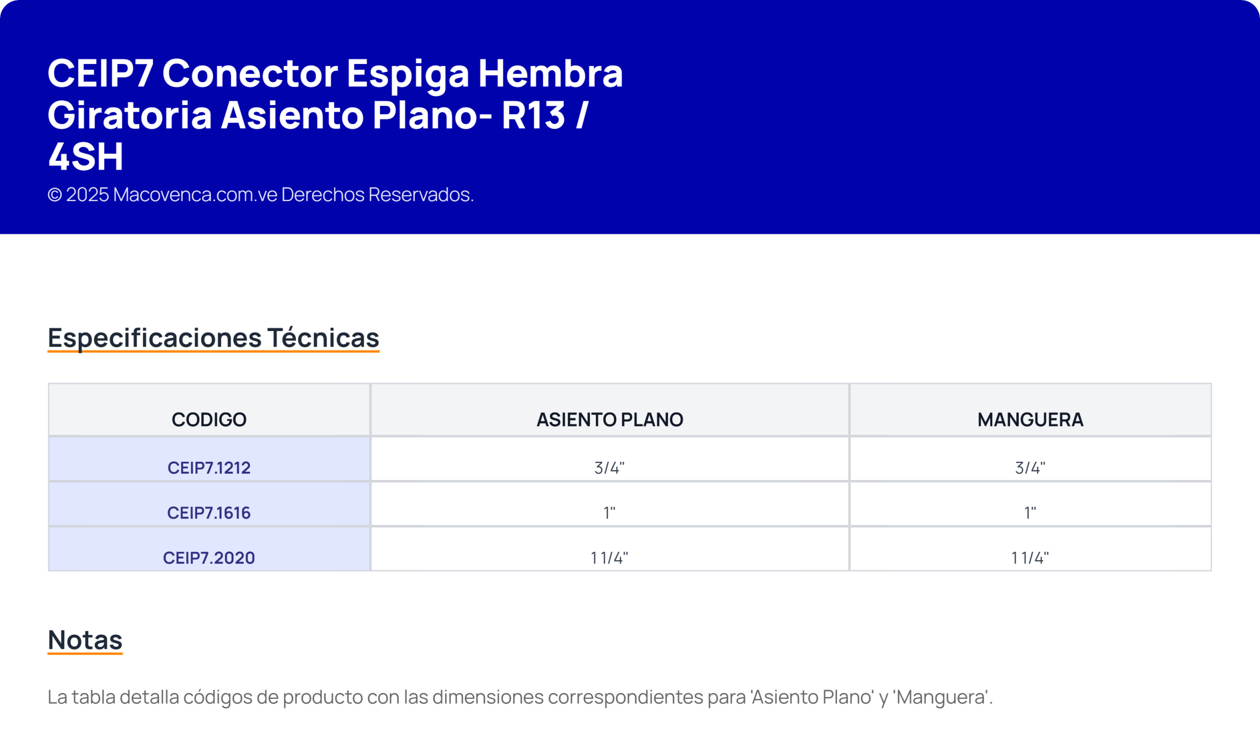 Conector (espiga) prensable con rosca hembra giratoria de asiento plano, para mangueras R13/4SH.