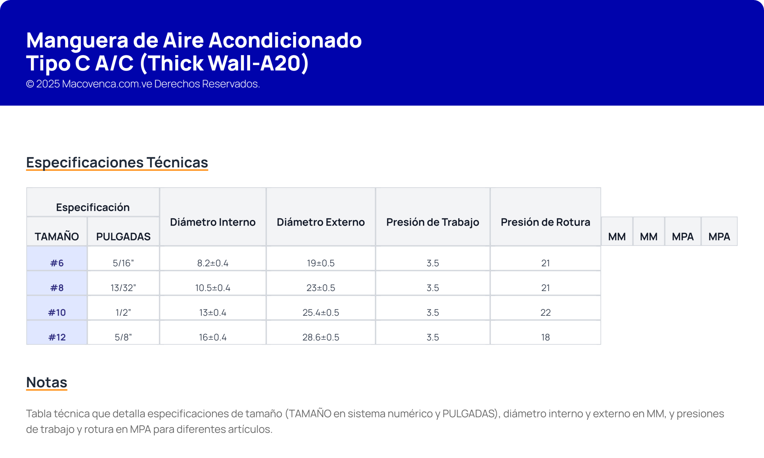 Manguera para sistemas de A/C, tipo C, pared gruesa, para refrigerantes como R134a.