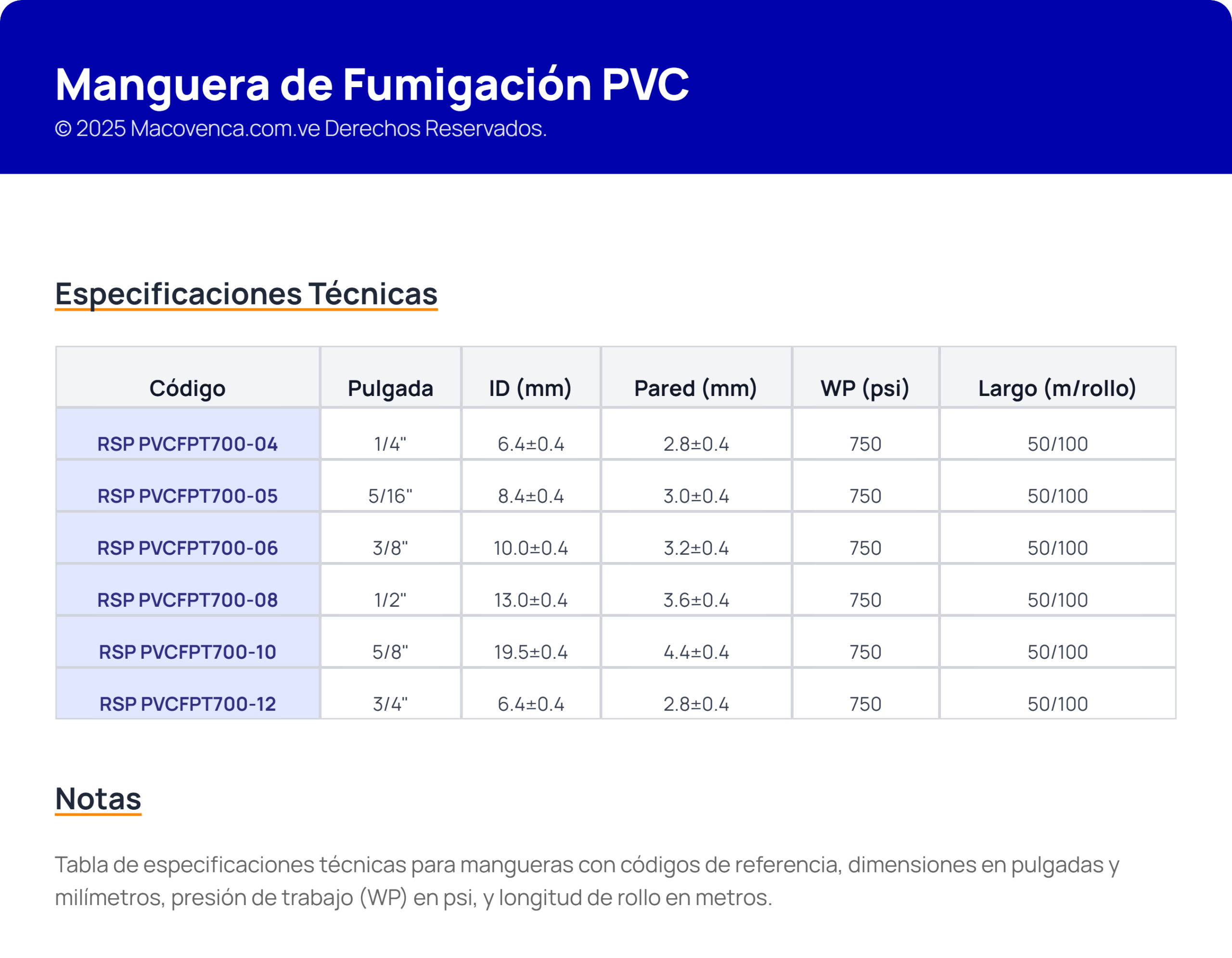 Manguera de PVC para agua a presión y pulverizadores agrícolas. Resistente a insecticidas, pesticidas, abrasión y con gran flexibilidad.