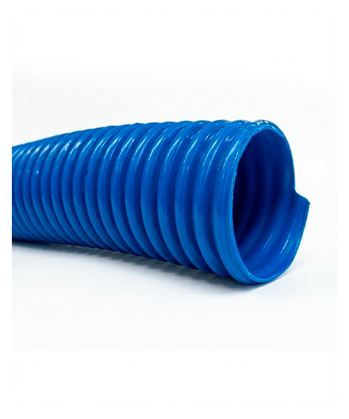 Manguera de PVC azul con espiral rígida para succión y descarga de agua en agricultura, limpieza de galerías y camiones cisterna.